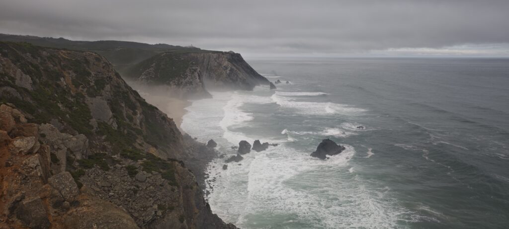 Nos miradouros, é bom ter cuidado com o vento, já que a vista é alta sobre o mar. Vamos passar por um ponto onde teremos uma vista incrível de toda a Praia Grande. Em seguida, descemos até ao parque de estacionamento da praia para uma pequena pausa. Quem quiser pode beber um café para recuperar as energias para a segunda parte da caminhada.